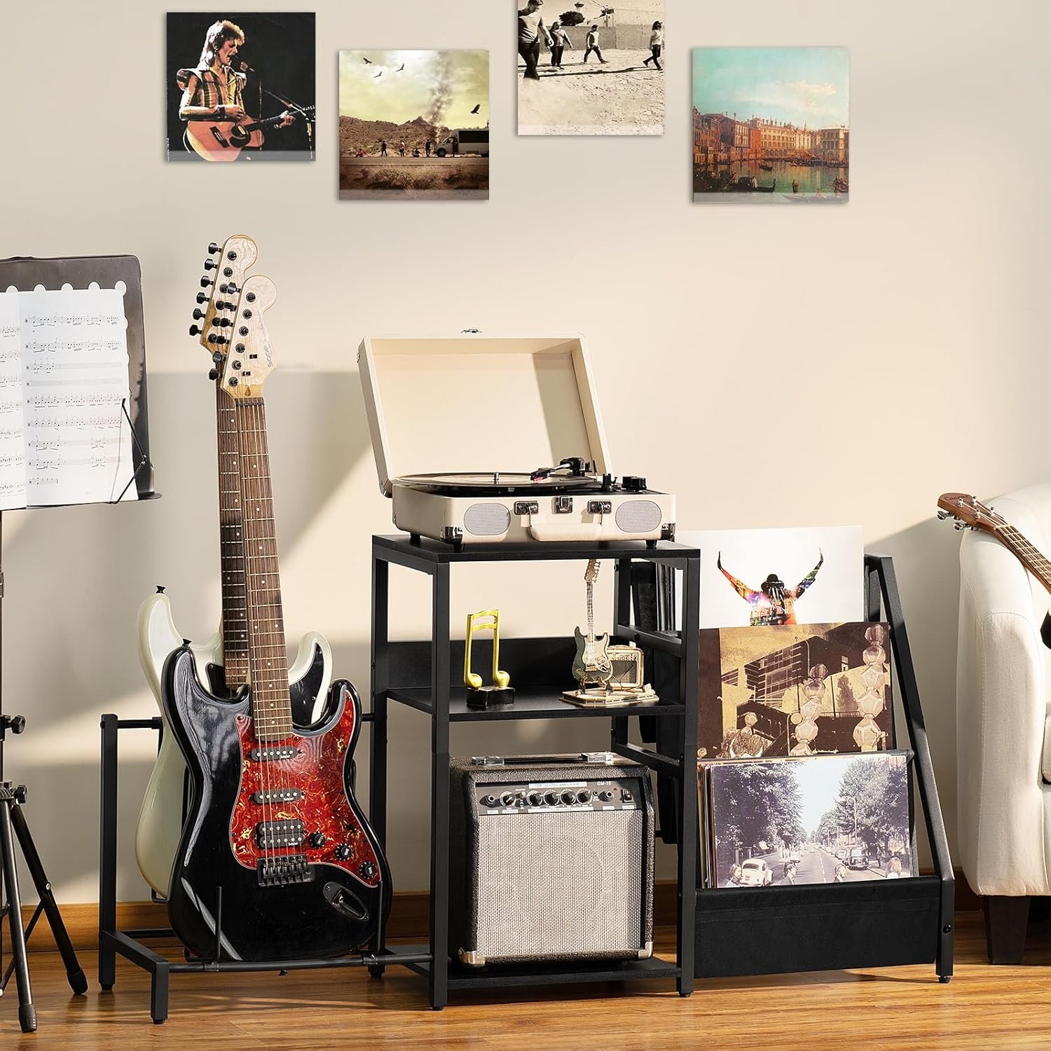 • ??Value Pack??: [ Charming Black Side Table ] The mid-century end table combines the rustic frosted black panel with metal stand, while retaining an industrial style that added a touch of elegance and mystery to your room. The two detachable U-shaped dividers on the small side table provide you with more storage options. You can categorize your books on the bottom shelf, or choose a larger single storage space for your collections, plants etc.[ Record Player Stand ] The black rustic record player stand has 3 tiers. The spacious tabletop is suitable for multiple sized record players. The 2nd and 3rd open storage shelves can hold all kinds of records and media essentials, storing up to 100 albums. The categorized storage of vinyl records holder combines art and practicality, filling your room with artistic atmosphere and keeping neatness.[ Your Storage Assistant ] These bed side tables are made of durable and sturdy wooden boards, corrosion and rust resistant metal frame, which ensures a longer usage. The sturdy bedside table also can serve as a storage cabinet for bedroom, living room, kitchen and other small spaces. You can also place it next to the sofa and pick up the delicious cake on the table to enjoy a wonderful home time when you are resting.(Narrow night stand size: 11.81 “D x 15.86 “W x 25.67 “H)[ Thoughtful Details ] The classic rectangular frame of the display storage shelf and lightweight design helps you move and carry it more easily. And we set up iron net and small wooden boards that can prevent the magazines, records and items from falling off on the 2nd and 3rd open shelves of the turntable stand . We also designed adjustable feet to help the skinny nightstand stay level on uneven floors.[ Thicker Packaging & Easy to Assemble ] We pack these slim record player stands in thicker foam and tough cardboard boxes to ensure they arrive in good conditions. These office side tables come with detailed instructions, labeled parts and assembly tools to help you assemble the album organizer shelf more easily.
